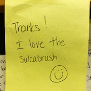 Continue to apply firm pressure while following the wavy gumline on the inside of the mouth, using the end marked ‘inside’.
